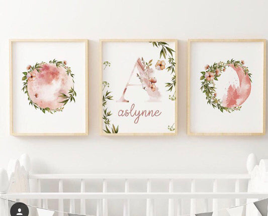 Botantical Moons Nursery Print with Custom Name - Set of Three