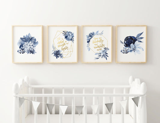 She is clothed / Wonderfully made Baby girl nursery wall prints in navy and gold