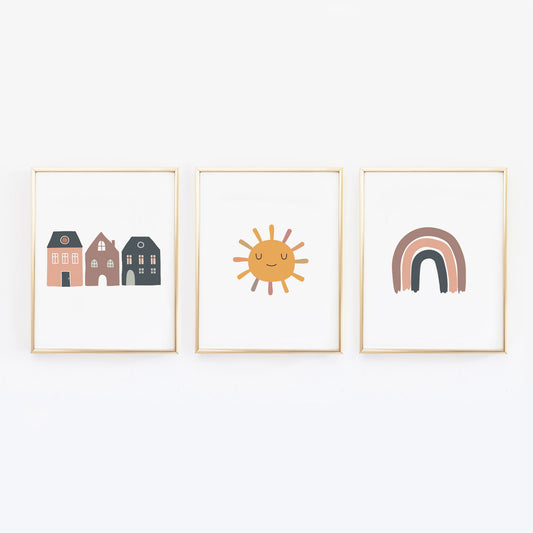 Rainbow Houses and Sun Boho Nursery Baby Girl Art