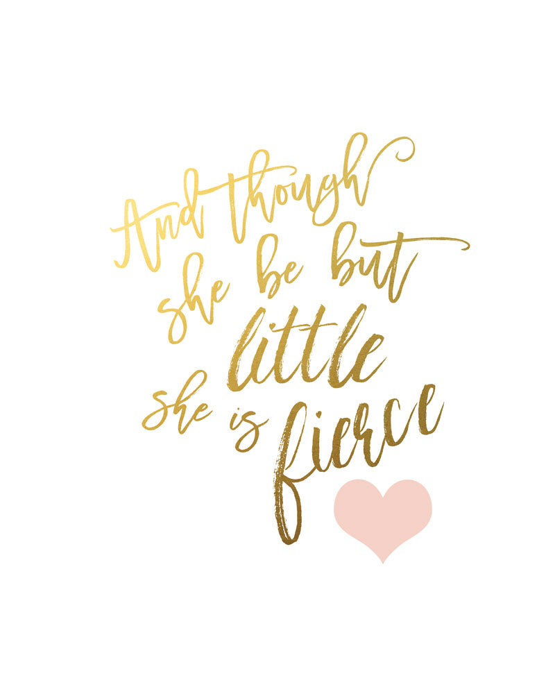 Gorgeous nursery prints for that soft feminine nursery you have planned. Two very popular sayings for a little girl's bedroom on a white background. "And though she be but little, she is fierce." "Let her sleep for when she wakes she will move mountains. "