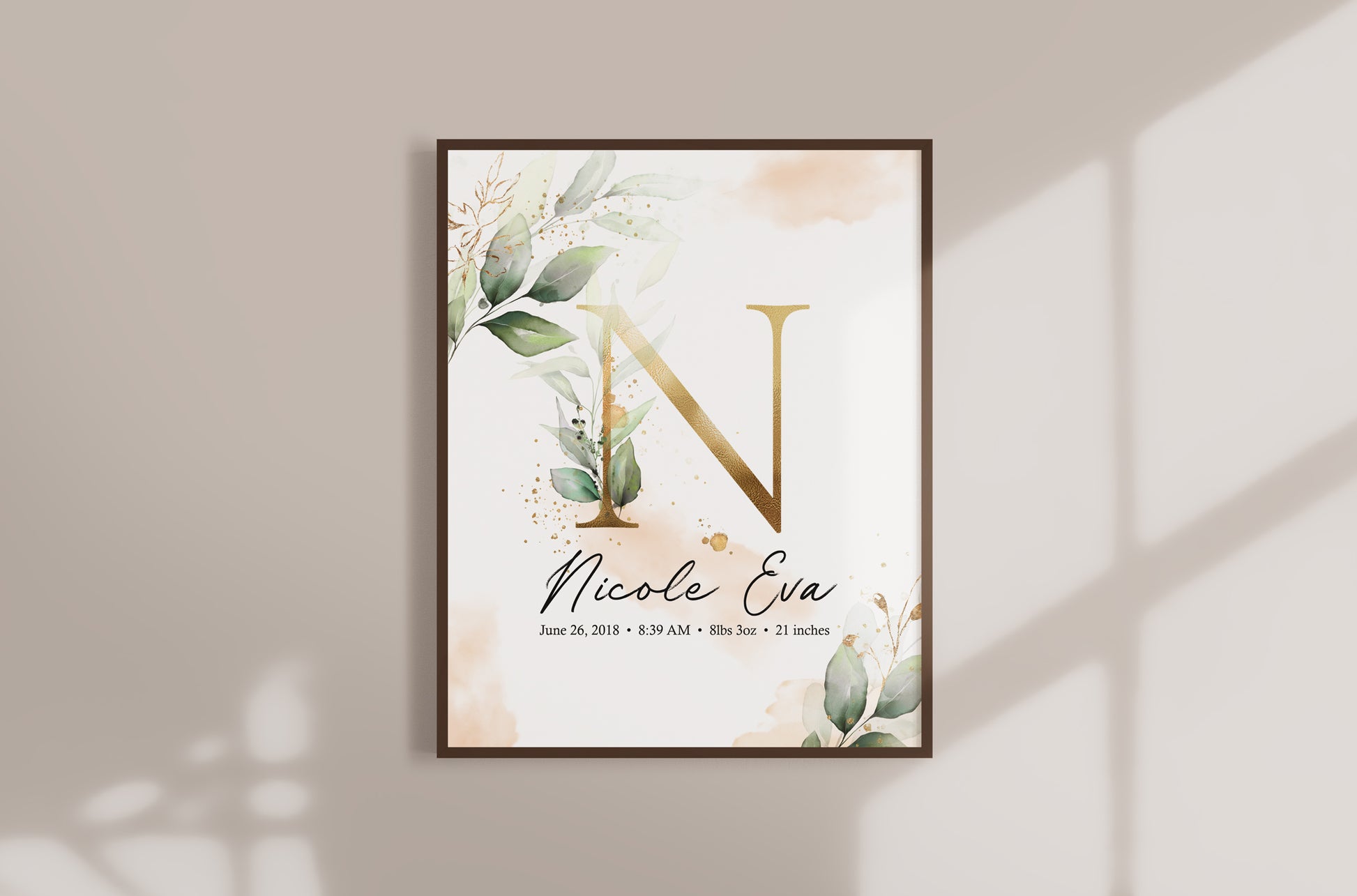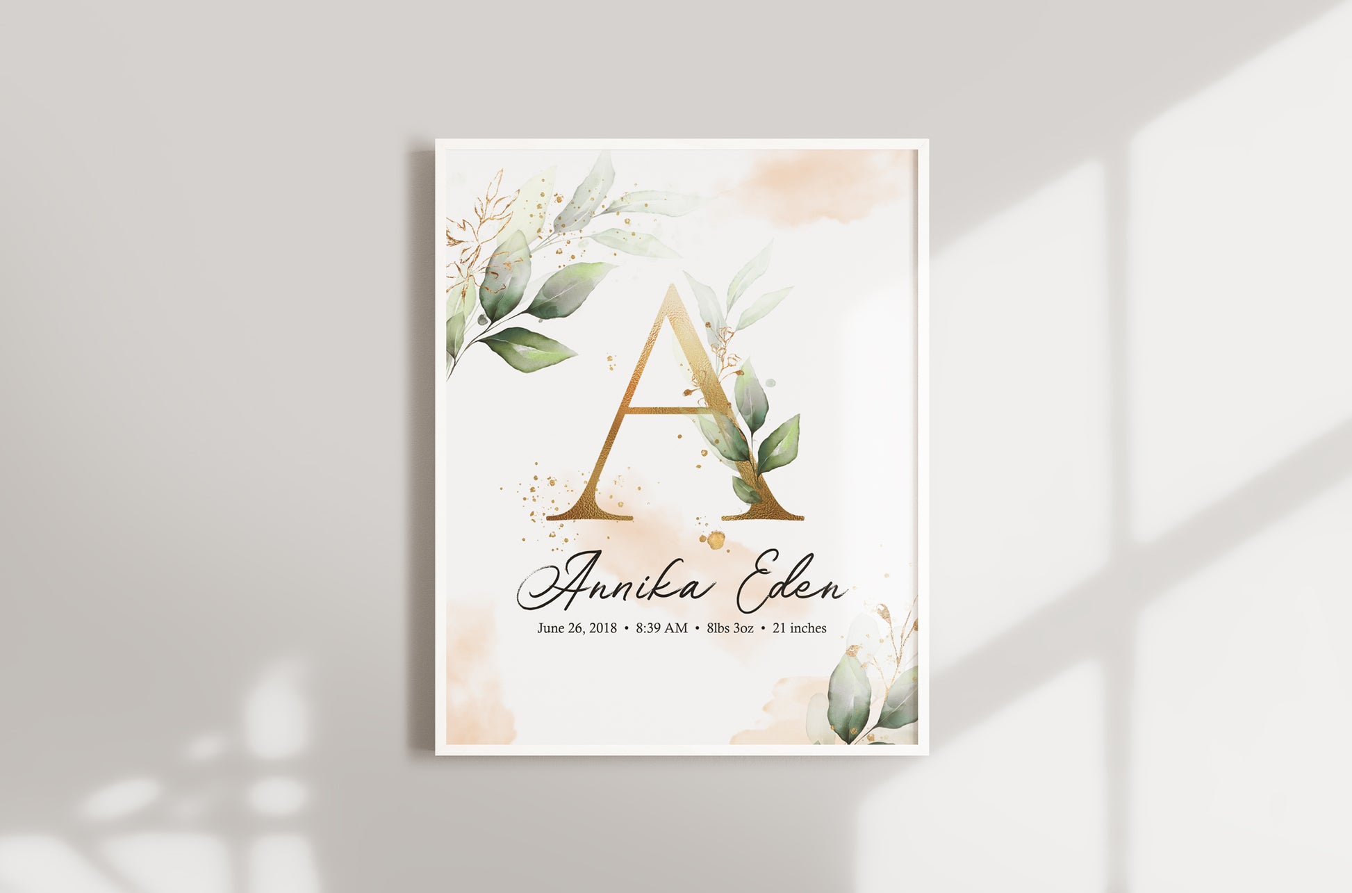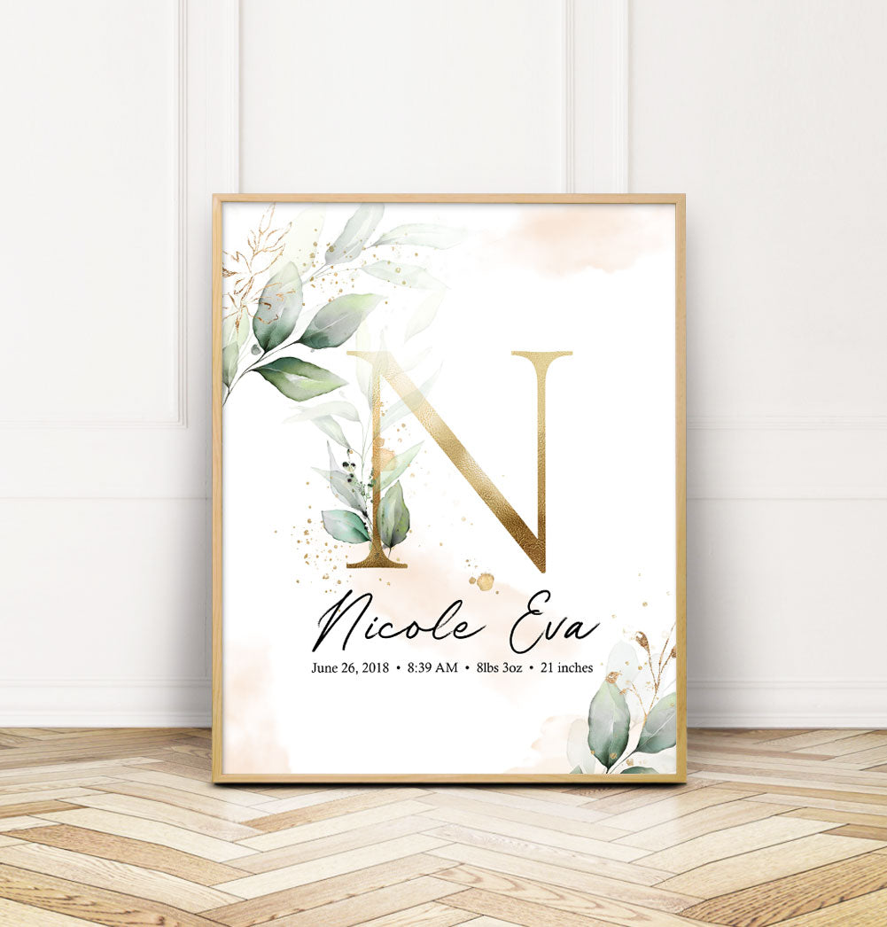 With a modern bohemian look of watercolor leaves and faux gold foil paint splashes, these birth announcement wall art will adorn your nursery walls for years to come. Perfect for the little baby girl's new nursery decor. The design of each letter is slightly different, making each unique.