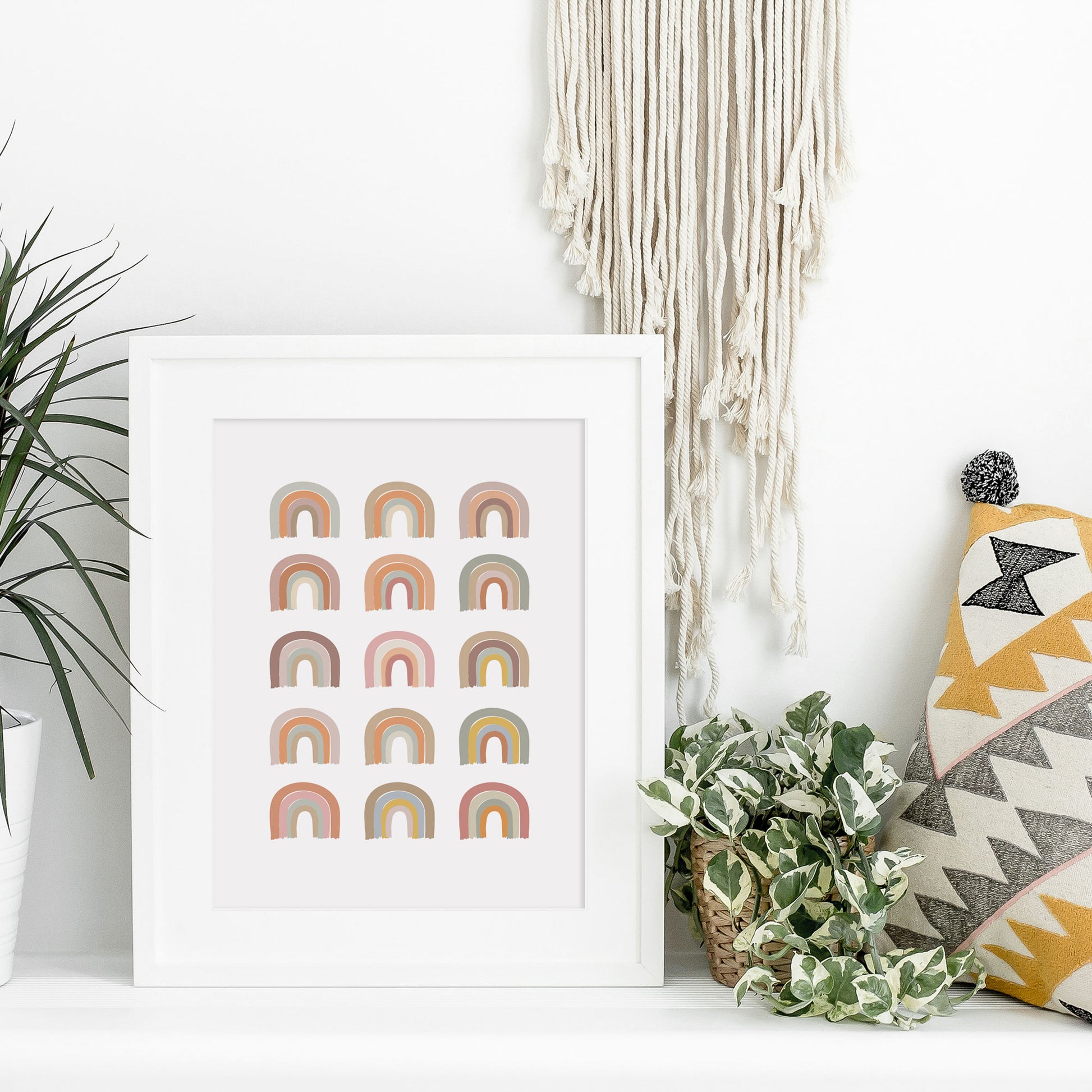For the modern bohemian nursery decor, this rainbow print is set in neutral earthy tones. Each rainbow has a combination of earthy pastels such as beige, pink mauve, terracotta and more! Complete your modern boho chic nursery with this print. Just frame and enjoy!