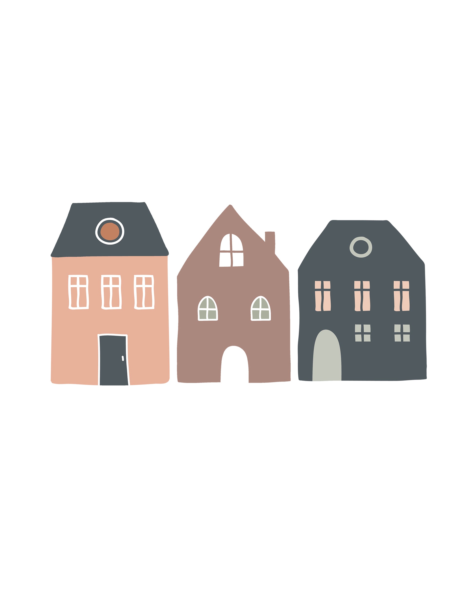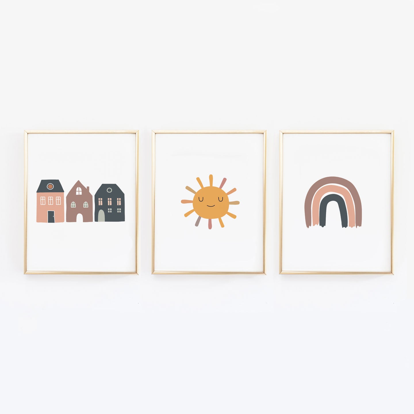 A set of three wall prints in trendy neutral earth tones for a modern boho nursery. The prints contain a row of houses, a rainbow and the sun. Complete your modern boho chic nursery with these prints. Just frame and enjoy!