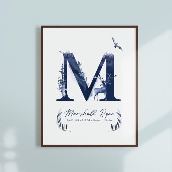 With a whimsical look of forest elements and watercolor splashes, these birth announcement wall art will adorn your nursery walls for years to come. Perfect for the little baby boy's nursery decor. The design of each letter is slightly different, making each unique.